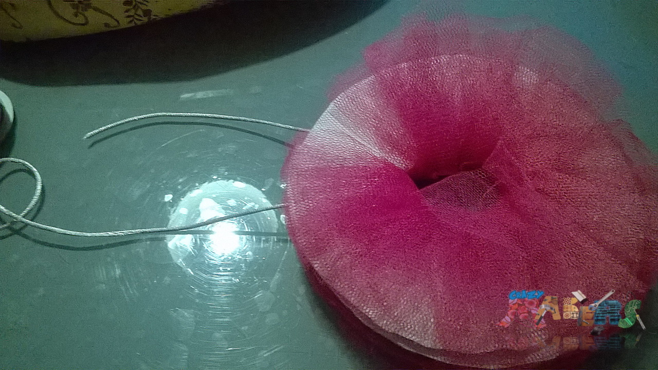 On vient ensuite enrouler le tulle autour des disques empilés en s'assurant que chaque tour passe bien dans le trou du milieu. Veillez à répartir harmonieusement les tours autour des patrons en carton.