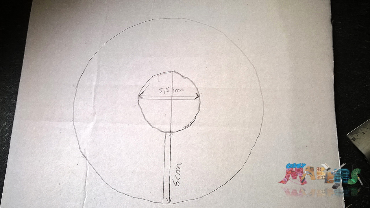 On commence par dessiner un patron en carton, l'épaisseur de carton du disque définira la longueur des franges du pompon.