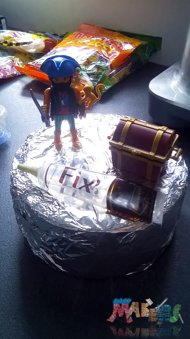 Avec de la colle alimentaire, maintenez en place le/les sujets de votre choix (ici un set de figurines pirates Playmobil) |