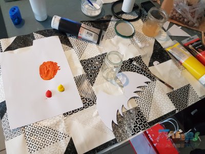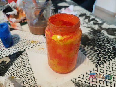 On lui fait faire des petits points de trois couleurs à l'intérieur du pot (Rouge, Orange et Jaune). Attention à ne pas trop étaler les points. |