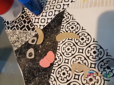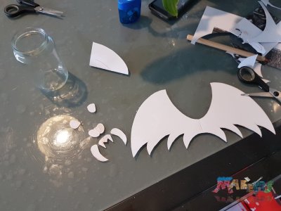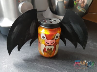 A l'aide de colle chaude, on colle les différentes pièces de la chauve souris, on dessine les pupilles des yeux, les trous du nez, on met une bougie, on pose le couvercle et c'est fini!