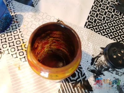 | Voici le pot une fois les trois couleurs appliquées. Ne reste plus qu'à applique du noir à l'intérieur pour faire ressortir le relief. il faudra une fine couche pourne pas bloquer la lumière. |