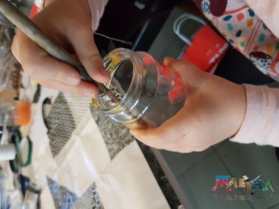 Ici deux solutions: soit on laisse sécher et on applique une fine couche de peinture noire au pinceau ou comme ici on bombe légèrement l'intérieur du bocal. |